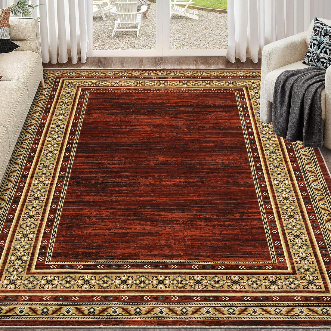 Garvee Bordered Red-Brown 10x13 Washable Area Rug, Farmhouse Neutral Low Pile Carpet, Stain Resistant Non Slip Soft Rug for Living Room Bedroom Dining Room
