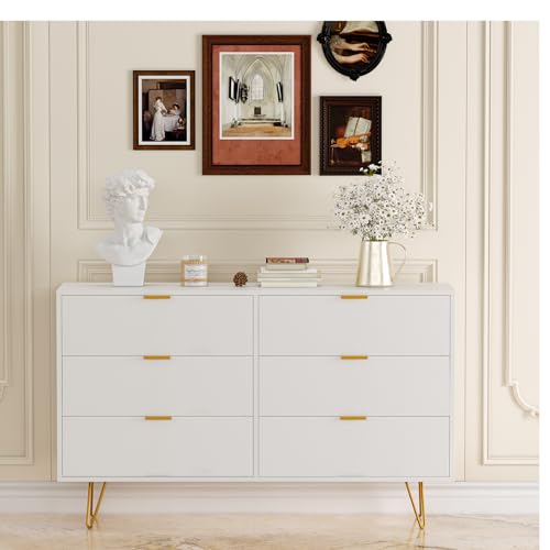 Garvee - Cómoda moderna de madera con 6 cajones color blanco con asas de metal, organizador de clóset pequeño para recámara, pasillo, sala de estar, grande