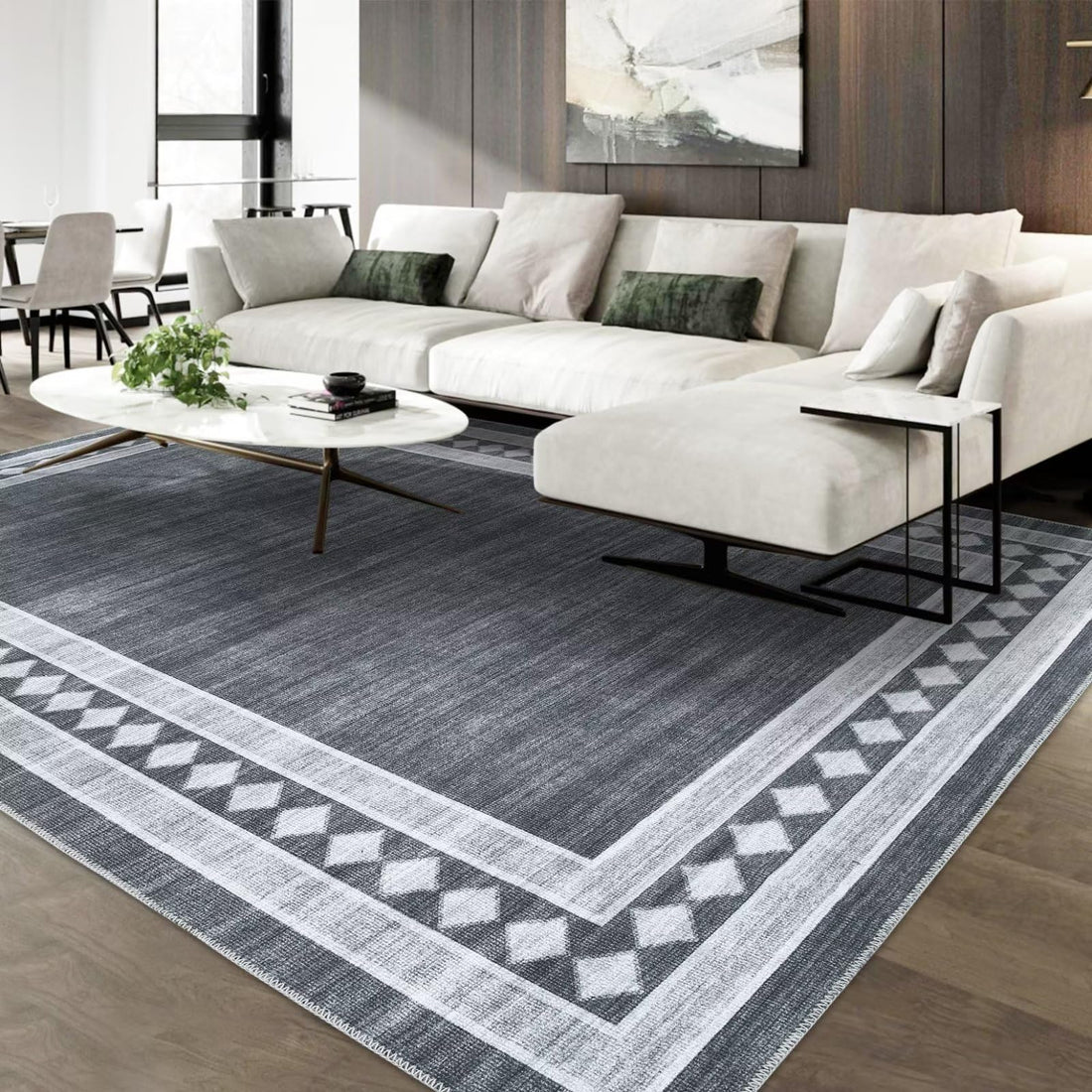 Garvee Bordered Dark Grey 10x13 Washable Rug, Modern Printed Low Pile Non Slip Carpet for Nursery Living Room Dining Bedroom Office