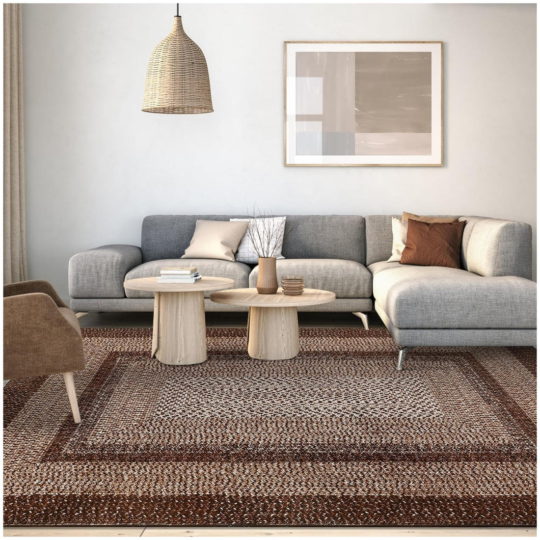 Garvee Bordered Brown 6x9 Braided Washable Rug, Low Pile Non-Slip Polyester Vintage Farmhouse Carpet for Living Room Bedroom