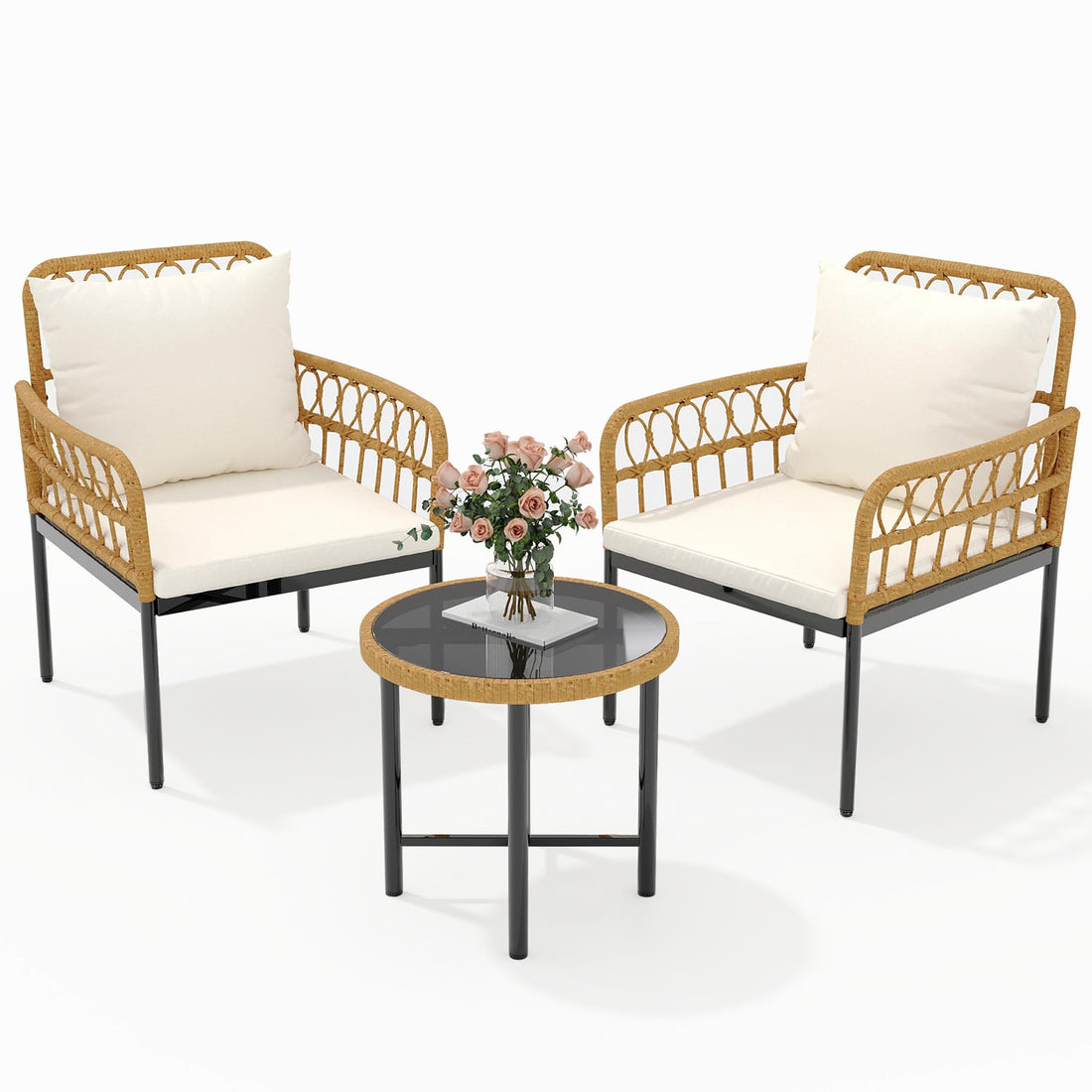 Garvee 3 Piece Outdoor Wicker Patio Bistro Set, All-Weather Rattan Conversation Set with Glass Top Coffee Table & Cushioned Chairs, Boho Balcony Furniture for Backyard, Poolside, Garden, Beige