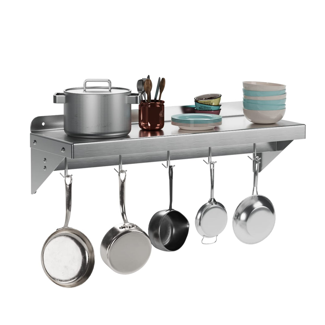 Garvee Stainless Steel Wall Mount Shelf 12 x 36 Inch, NSF Certified Shelf with 5 Hooks, 200 lb Load Capacity Floating Shelf Kitchen Storage Racks Commercial Shelves for Restaurant, Hotel and Garage