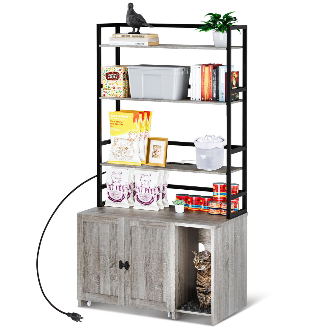 Garvee Cat Litter Box Enclosure, Hidden Cat Litter Box Furniture, Large Double Door Cat House with 3 Shelves and Charging Station, Push-Pull Mobile Chassis - Grey