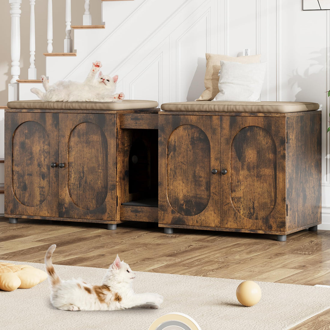 Garvee Litter Box Enclosure with Double Room, Hidden Cat Litter Box Cabinet Furniture for 2 Cats with Storage Groove & Odor-Reducing Mat, Wooden Enclosed Cat House for Home Apartment, Dark Walnut
