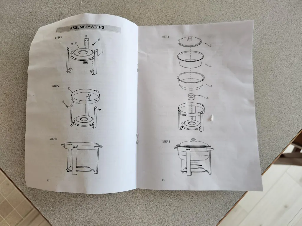 I got this buffet set to hold food hot during parties. This set took some time to put all of the parts together with the screws. The directions were helpful in putting the set together. Once it was setup the stand was very sturdy, level and strong to hold water and my food. I like that the lids have holder, this was very nice to keep them closely by the dish. The cooking fuel fit perfecting into the bottom and kept our food warm for about 2 hours. I also like that it came with a cover to turn the fuel off when the party was over. The set was very nice for our parties and was super easy to clean up afterward, by placing everything into the dishwasher.