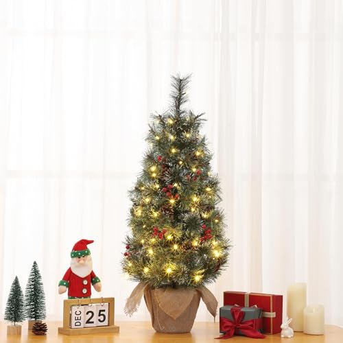 Garvee Pre-Lit Artificial Small Christmas Tree 3ft with 78 Warm White Lights, Tabletop Mini Christmas Tree with a Burlap Base, Battery Operated and Timer Function, Christmas Decoration for Home, 2 PCS