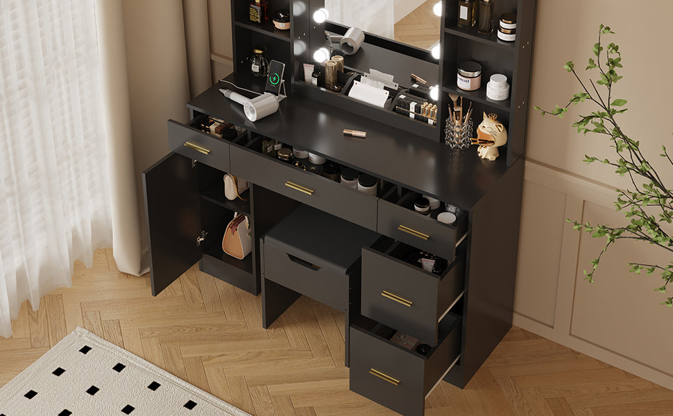 Garvee Vanity Desk with Mirror and Lights, Makeup Vanity Set w/Desk and Chair, Power Outlet, Makeup Vanity Desk with 6 Storage Shelves, 2 Large Drawers and 3 Color Adjustable Brightness, Black