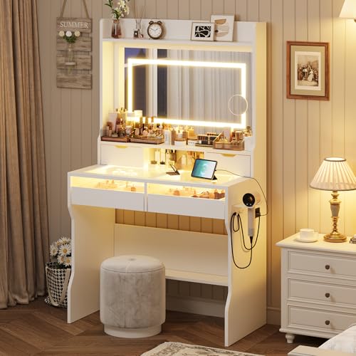 Garvee Vanity Desk with LED Mirror, 3 Mode Lighting, Charging Station, 4 Drawers, Shelves, Cushioned Stool, White, Bedroom