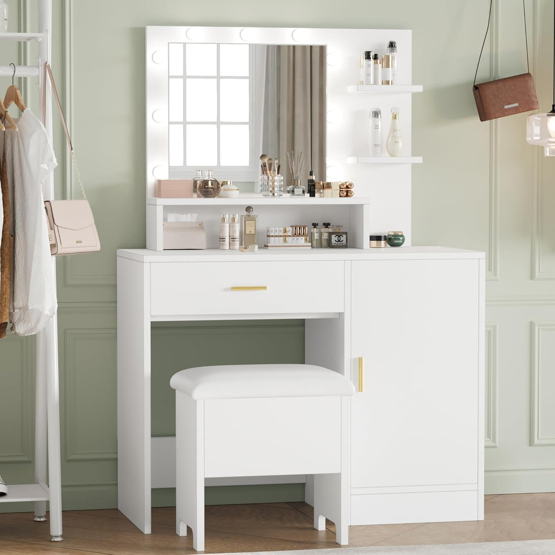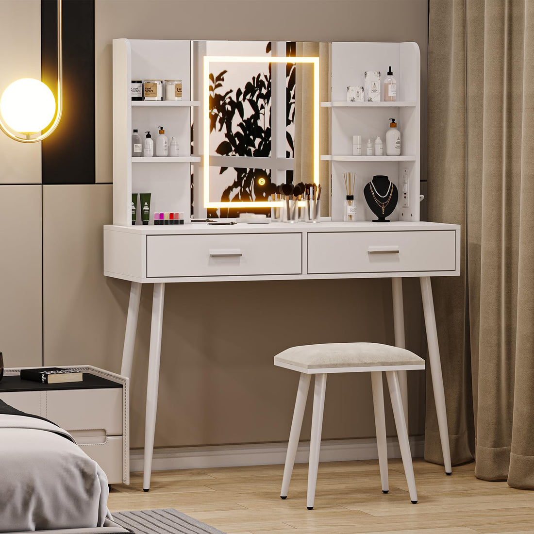 Garvee 43.3'' Vanity Desk Stool Set, Modern Makeup Table with Lighted Mirror, Power Outlet, 7 Drawers, 4 Open Shelves, White