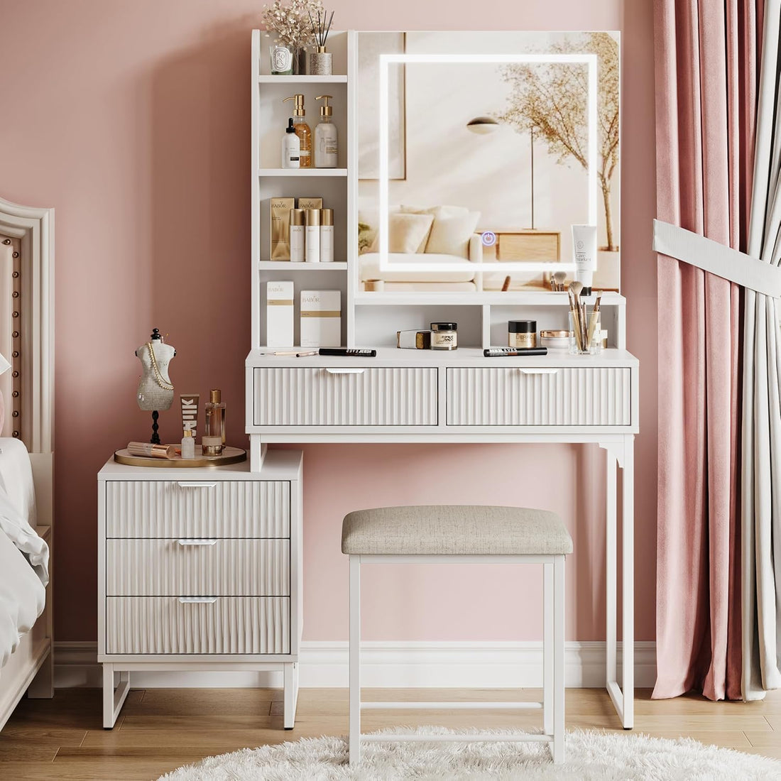 Garvee Vanity Desk, Makeup Vanity Desk with Mirror & Lights-3 Lighting Modes, Large Drawers and Three Level Storage & Tiers of Open Shelves for Bedroom, White