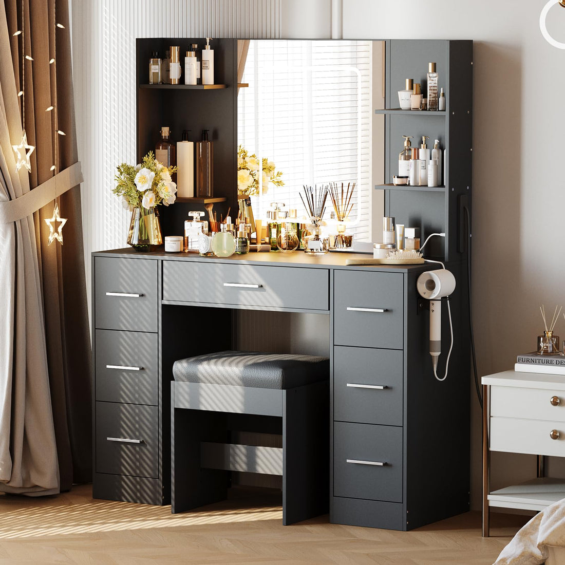 Garvee Vanity Desk with Mirror, Led Lights, Power Outlet and Stool, Makeup Vanity Table with 7 Drawers and 6 Storage Shelves, 3 Color Modes, Dressing Table for Bedroom Dressing Room (Black)