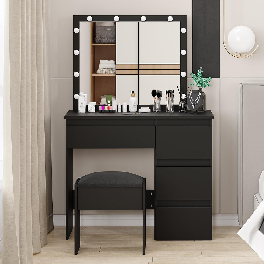Garvee Black Vanity Desk with Mirror and Lights, Makeup Vanity Desk with Sliding LED Lighted Mirror, Power Outlet, Makeup Vanity Set with 4 Drawers, Storage Shelves, Cushioned Stool for Bedroom
