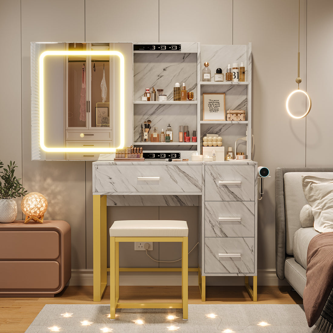 Garvee Vanity Desk with Mirror and Lights, Makeup Vanity Desk with Sliding LED Lighted Mirror, Power Outlet, Makeup Vanity Set with 4 Drawers, Storage Shelves, Cushioned Stool for Bedroom, Marble White