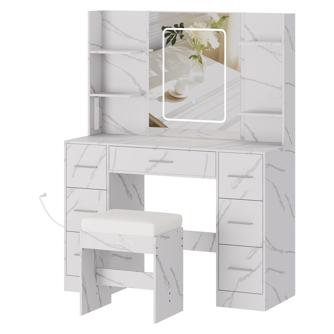 Garvee 43.3'' Vanity Desk Stool Set, Modern Makeup Table with Lighted Mirror, Power Outlet, 7 Drawers, 4 Open Shelves for Small Bedroom, Faux Marble