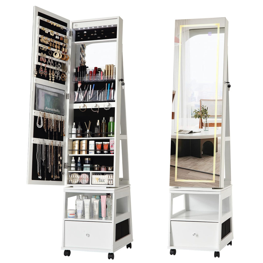 Garvee 360° Swivel Jewelry Cabinet with LED Lights, Inside Makeup Mirror, Rotatable Full Length Mirror with Jewelry Storage, Lockable Standing Jewelry Armoire Organizer with Drawer and Wheels (White)