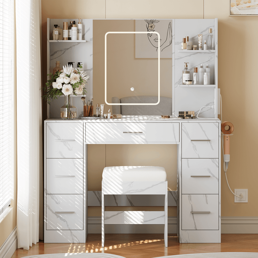 Garvee 43.3'' Vanity Desk Stool Set, Modern Makeup Table with Lighted Mirror, Power Outlet, 7 Drawers, 4 Open Shelves for Small Bedroom, Faux Marble