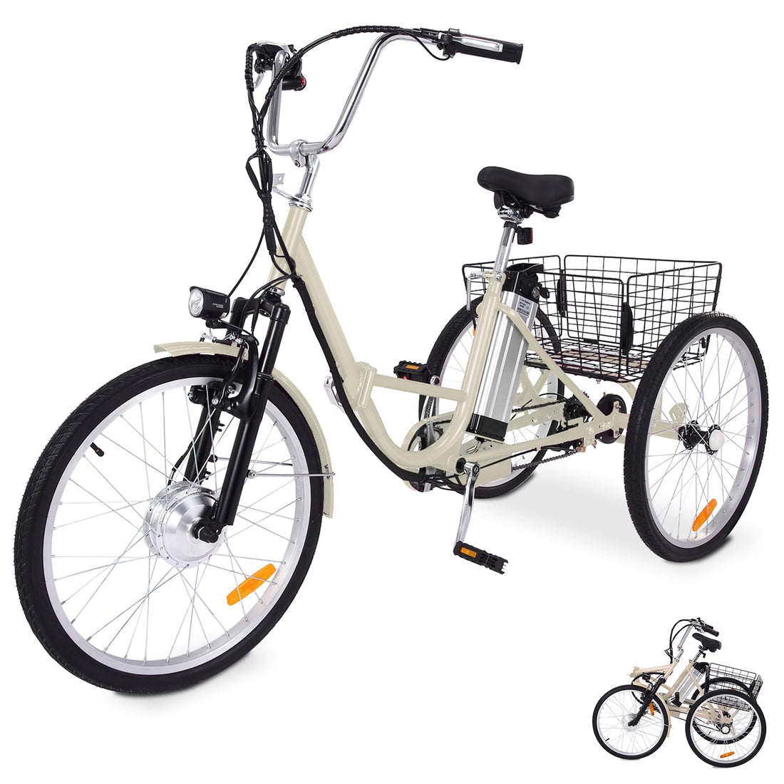 Garvee 24 Inch Adult 3 Wheel Electric Tricycle with Basket, Fat Tires,7 Speeds,350W Powerful Motor, 36V 10Ah Removable Battery - Beige