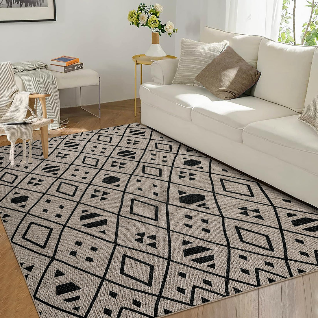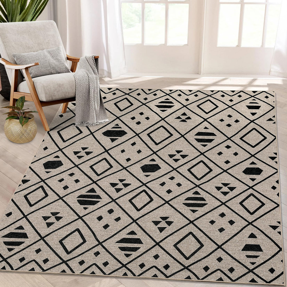 Garvee 10'x13' Area Rug Boho Textured Design Living Room Non Slip Low-Pile Soft Tribal Print Bedroom Rug Stain Resistant Playroom Carpet Office Black