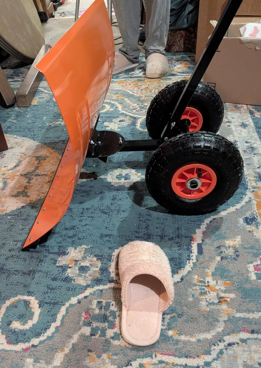 Works amazing if you have a flat surface. Best in light fluffy snow. A bit hard to push in heavier snow and slush. Better for business rather than home use. Easy to assemble. Adjusts as it should. It is large and takes a lot of room when not in use. Used a size 9 slipper for size comparison.