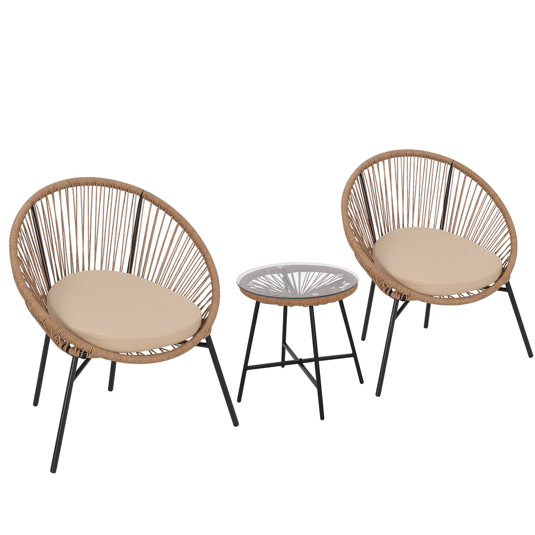 Garvee 3 PC Acapulco Chair Set, All-Weather Modern Patio Furniture Set with Cushions, Plastic Rope, Glass Top Table and 2 Chairs, Woven Patio Conversation Bistro Set, Brown