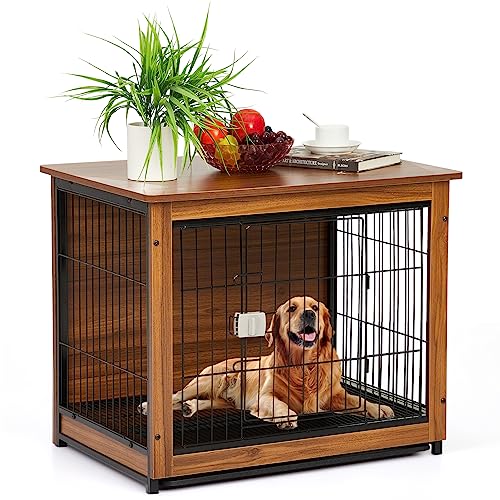 Garvee Dog Crate Furniture, Double Doors Wooden Dog Kennel Cage, 32.5" Indoor Dog Crate with Pull-Out Tray & Removable Wheels, Decorative End Table Pet House Chew-Resistant for Medium Dog, Brown