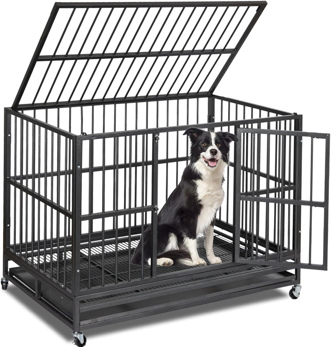 Garvee 48" Heavy Duty Dog Crate, Cage Kennel with Wheels&Brakes, High Anxiety Indestructible, Sturdy Locks Design, Double Door and Removable Tray for Large Pets(Black)