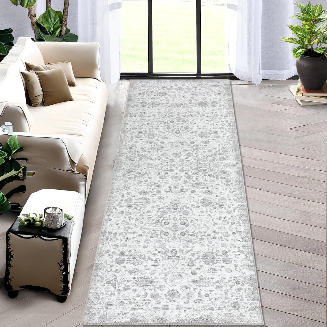 Garvee Washable Area Rug 8x10 Bohemian Rug Soft Low-Pile Washable Rug with Non-Slip Backing, Grey Plant Floral Pattern Vintage Rug for Living Room Bedroom Dining Home Office,8x10