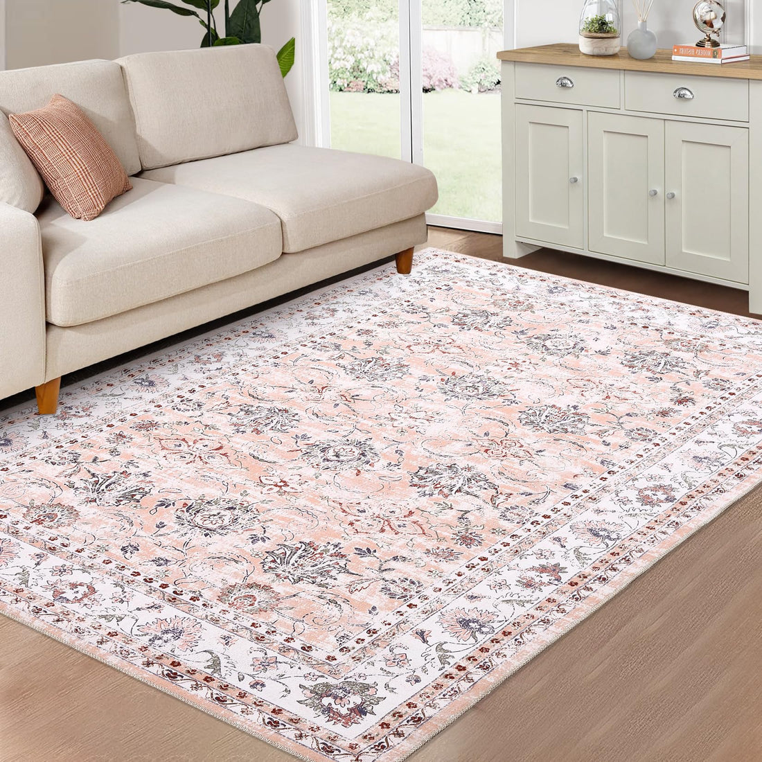 Garvee Washable Rug 5x7 Area Rugs Non-Slip Vintage Floral Print for Living Room Bedroom Ivory Pink
