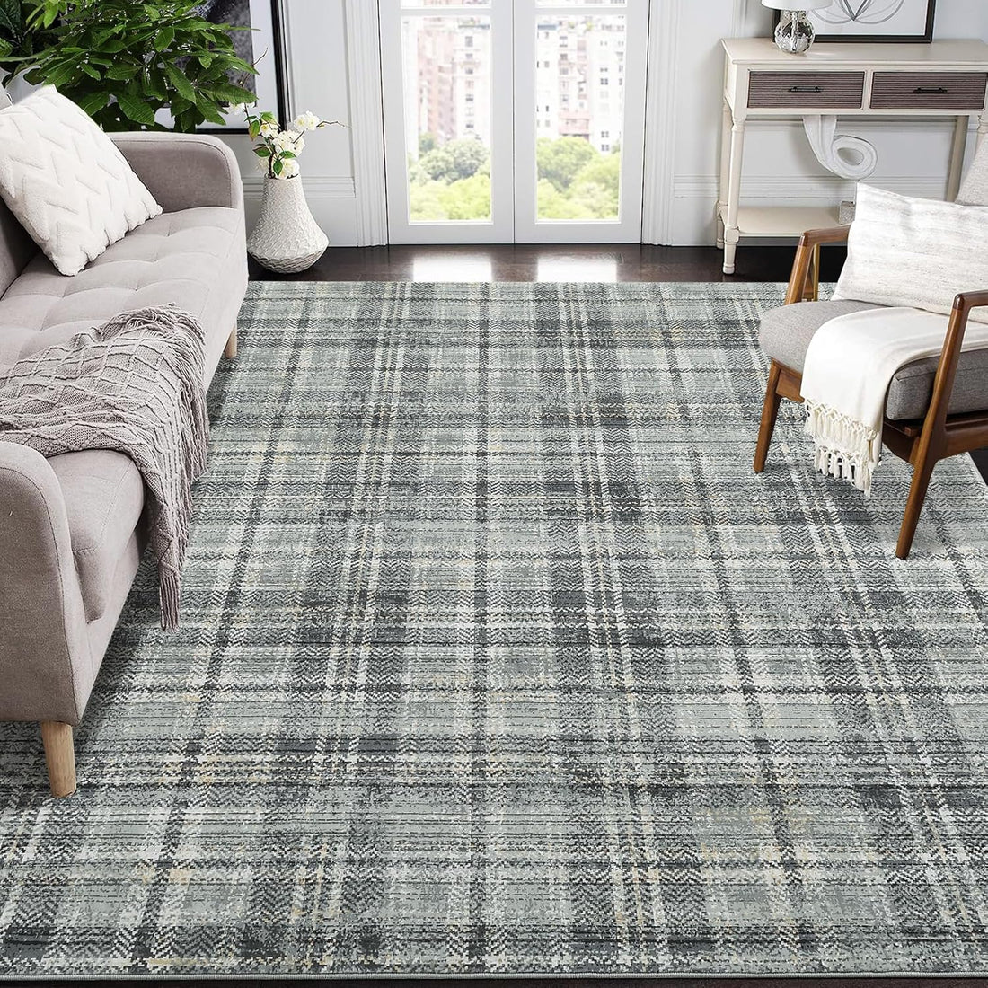 Garvee Washable Rug 8x10 Modern Checkered Area Rugs for Living Room Contemporary Plaid Print Accent Rug Non Slip Backing Throw Carpet Indoor Soft Lightweight Rug for Bedroom Dining Office Grey