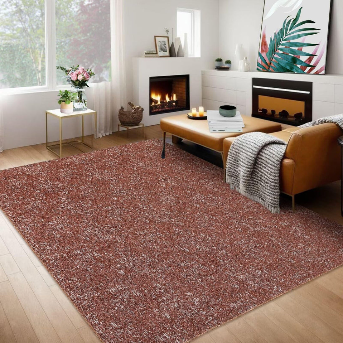 Garvee Bordered Red-Brown 8x10 Vintage Rug, Solid Low Pile Carpet, Non Slip Stain Resistant for Living Room, Bedroom, Dining Area