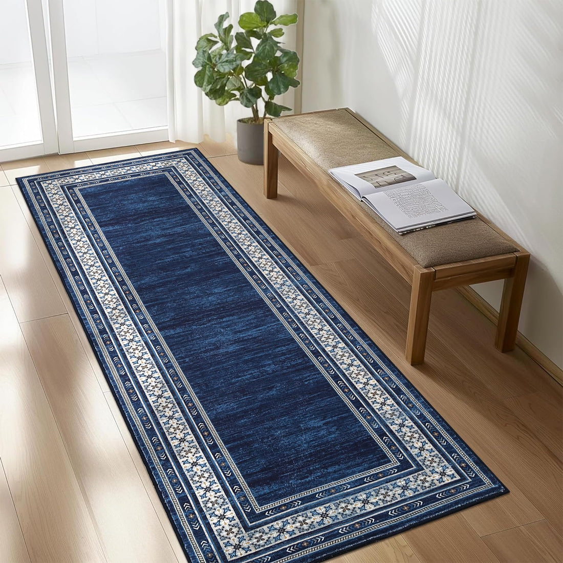 Garvee Bordered Dark Blue 2x6 Washable Runner Rug - Soft, Non-Slip, Stain Resistant Carpet for Hallways, Entryway, Bedroom