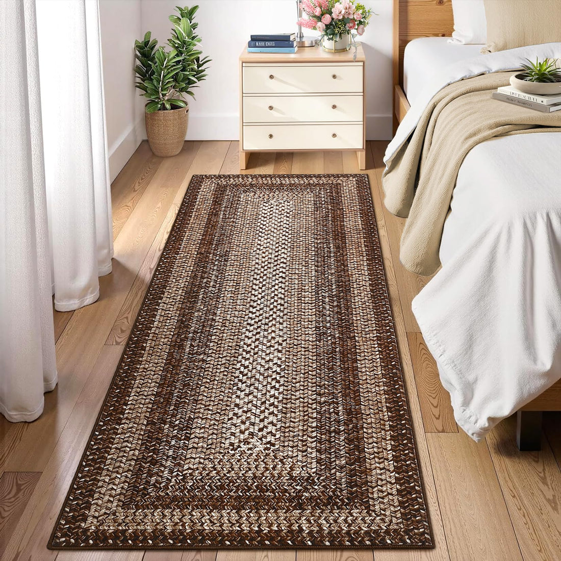Garvee Bordered Brown 2x10 Runner Rugs for Hallways, Washable Braided Printed Area Rug with Non-Slip Backing, Low Pile Rugs Carpet Runners for Bedroom Entryway Kitchen