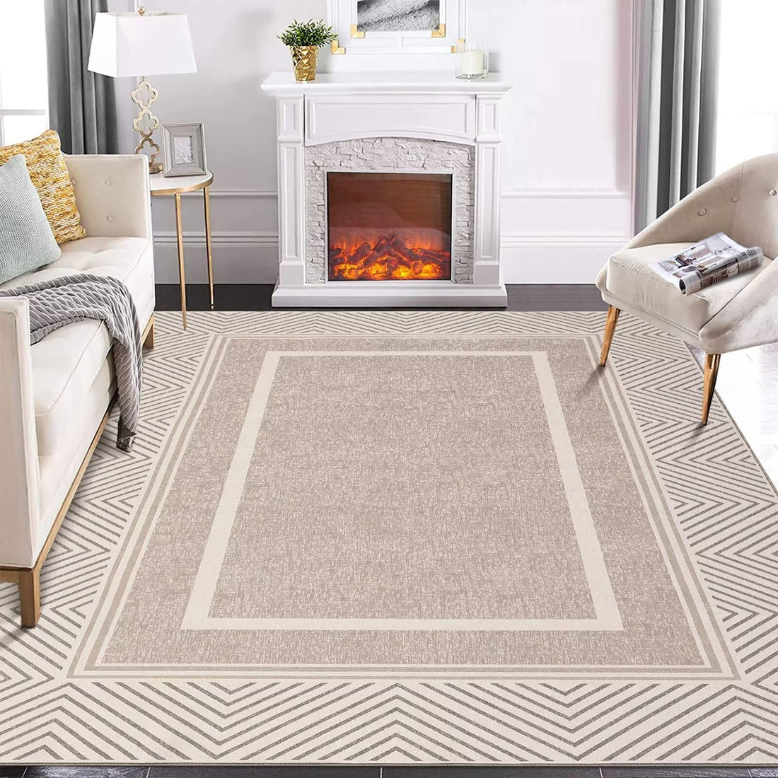 Garvee Modern Neutral Bordered Area Rug Brown 5x7 Soft Washable Non-Slip Polyester Geometric Low-Pile Living Room Bedroom Nursery