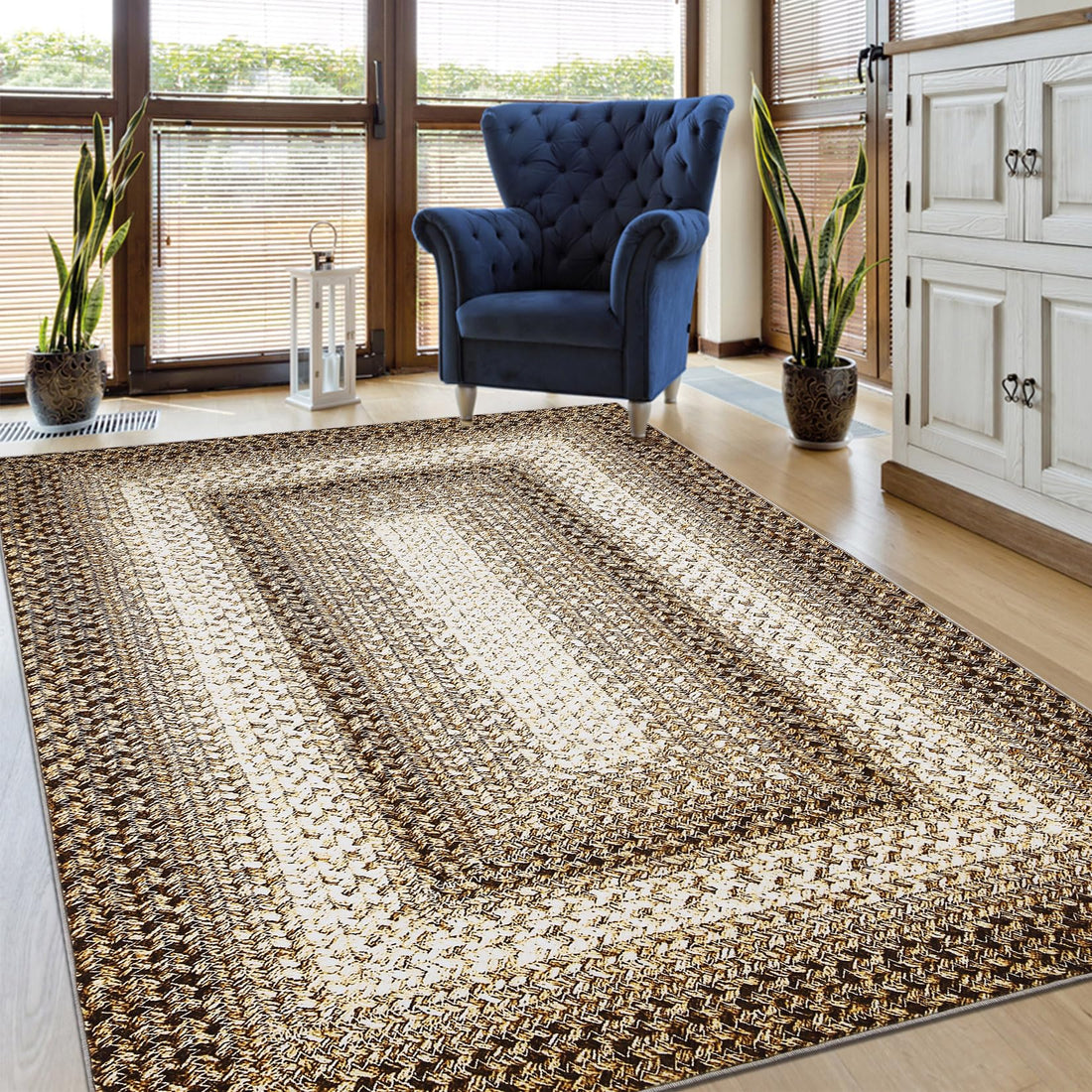 Garvee Bordered Brown 6x9 Braided Washable Rug, Low Pile Non-Slip Polyester Vintage Farmhouse Carpet for Living Room Bedroom
