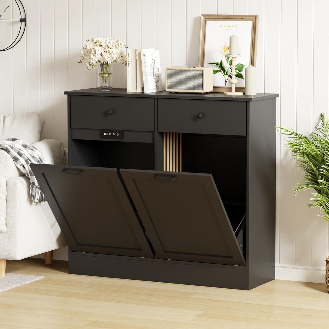 Garvee Double Tilt Out Trash Cabinet with Deodorizing Function, 20 Gallon Wooden Laundry Trash Can Cabinet with 2 Drawers, Farmhouse Hidden Pet Proof Garbage Can for Kitchen, Black