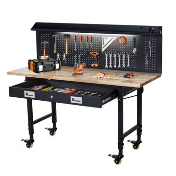 Garvee 60"x 22" Adjustable Workbench + Drawer Storage + Heavy Duty + Rubber Wood Top + Removable Pegboard + Power Outlet + Hooks + Tool Storage + Garage, Warehouse, Workshop