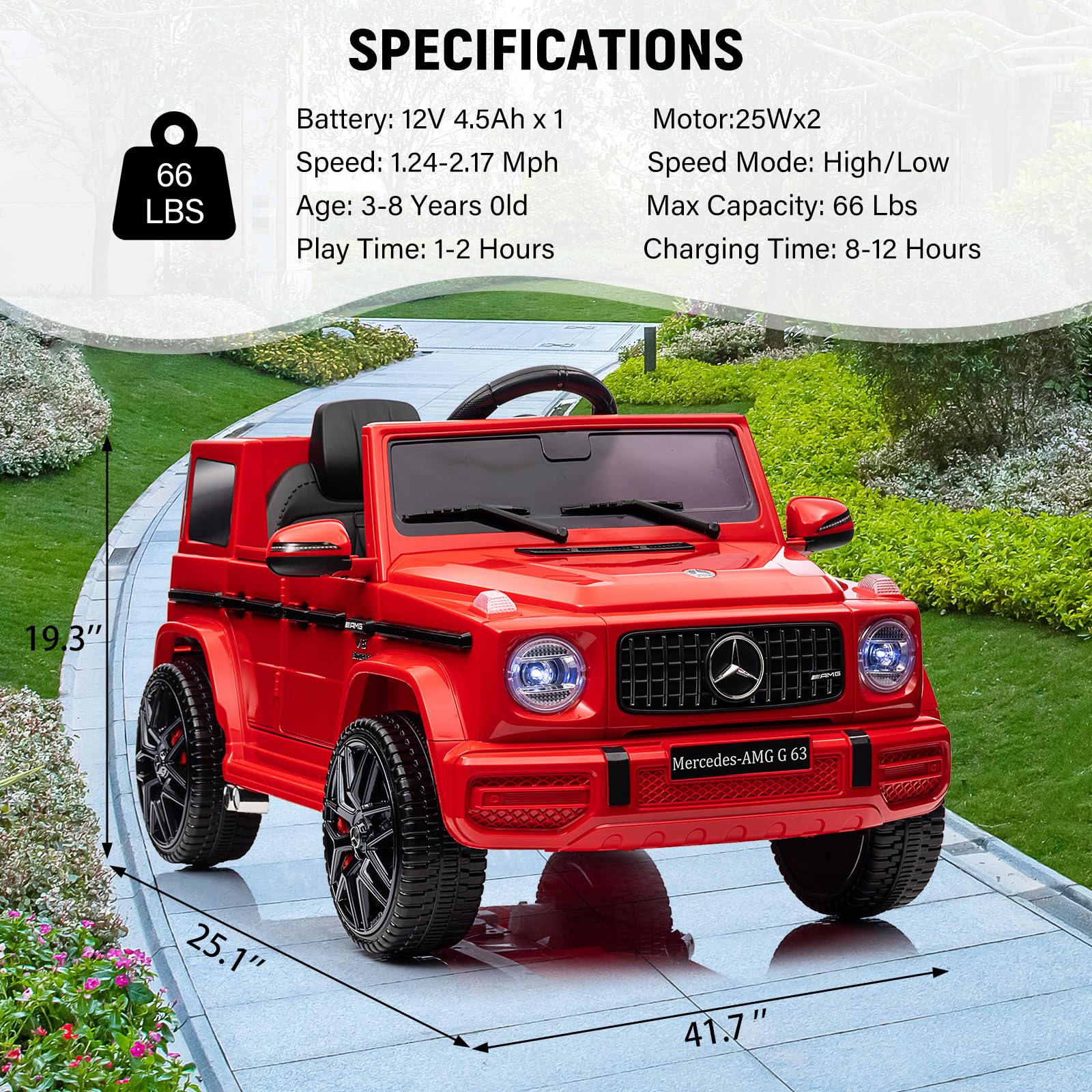 Garvee Ride P Series 12V Mercedes-Benz G63 Ride-On: Remote Control, Suspension, Soft Start, LED, Bluetooth, Music, 2x25W Motors - Red