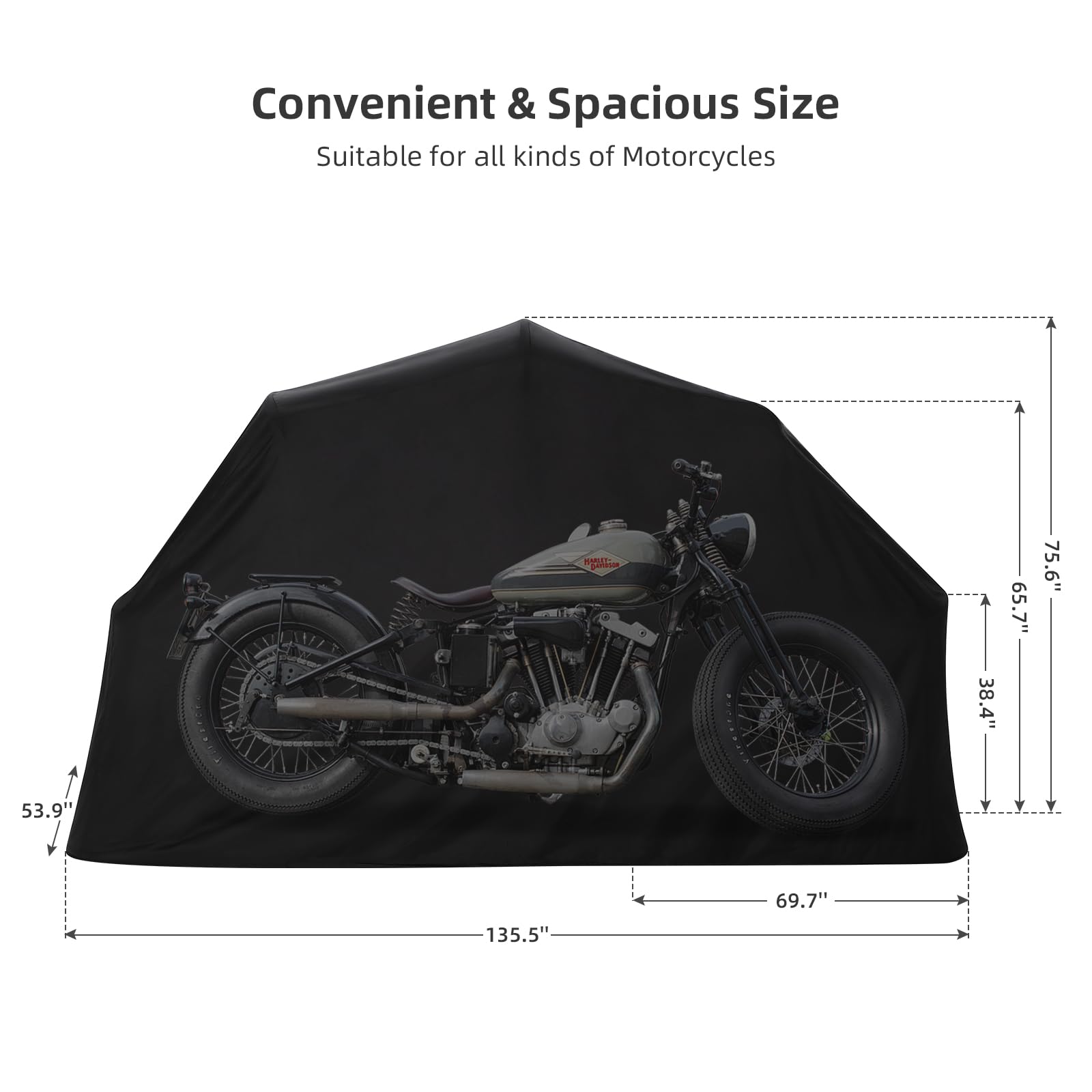 Our motorbike cover uses upgraded 600D Oxford cloth, adopting rigorous water repellence processes, durable, scratch-resistant, tear-proof, and against UV rays.