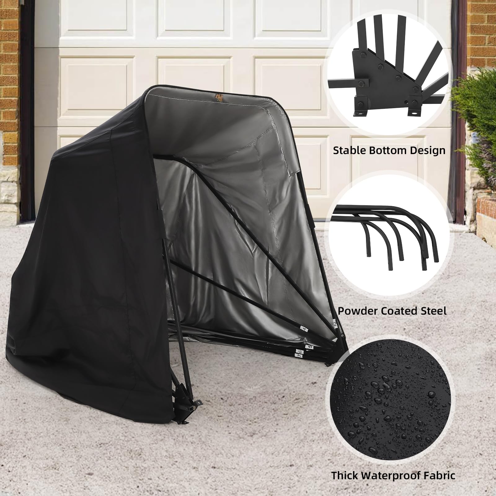 The weatherproof motorcycle storage shed offers protection from harmful sunlight, rainwater, dust, and snow, keeping your motorcycle safe and shielded throughout the year.