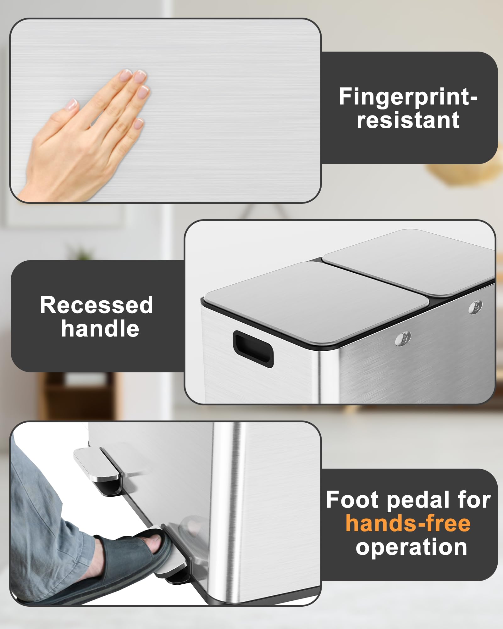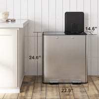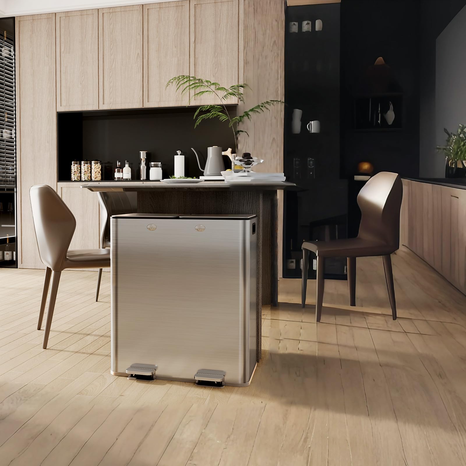 Garvee Large Dual Trash Can 2 x 8 Gallons- 60 Liters Stainless Steel Kitchen Double Trash Can,2 Compartment Trash Can Combo Garbage Bin with Separated Lid and Foot Pedal for Kitchen