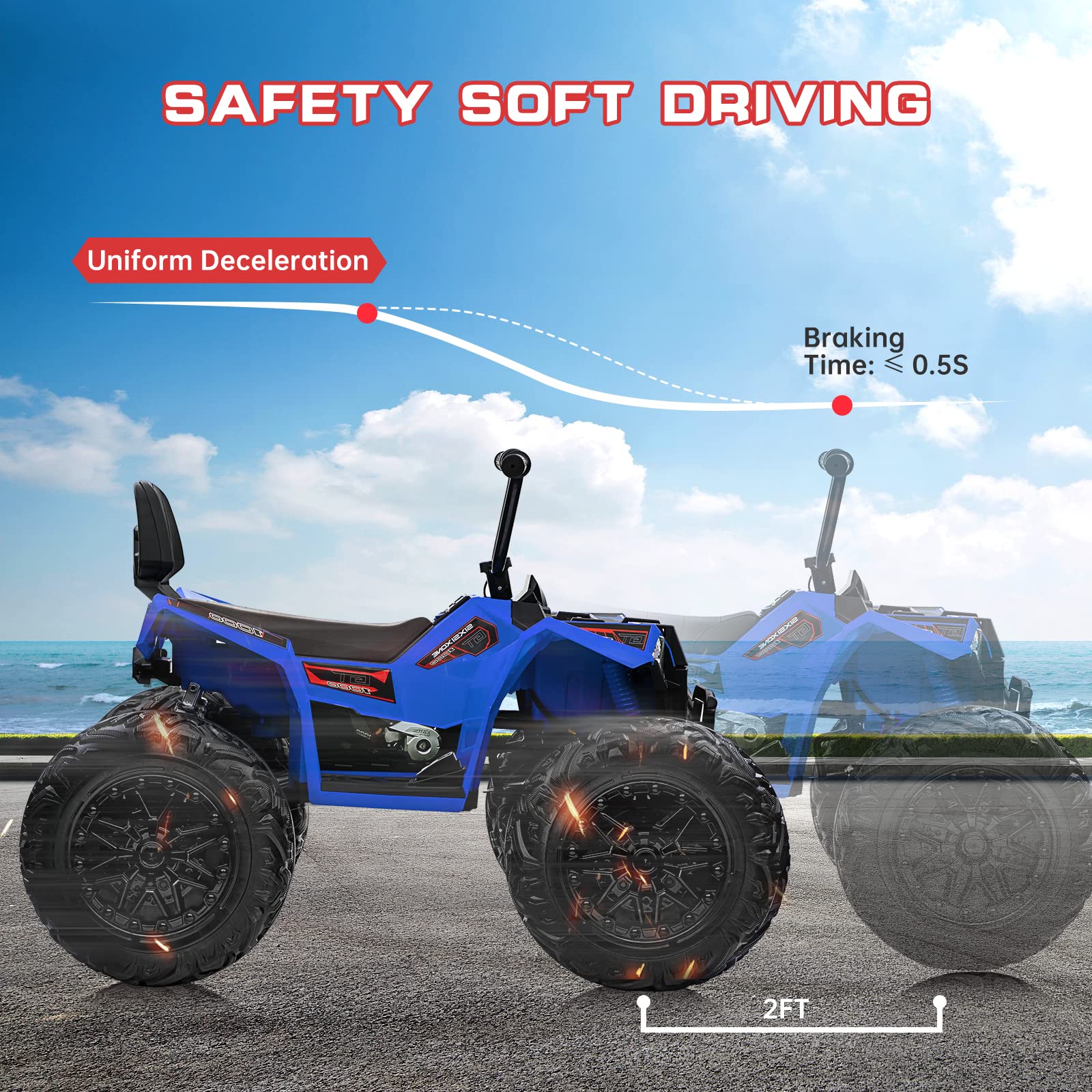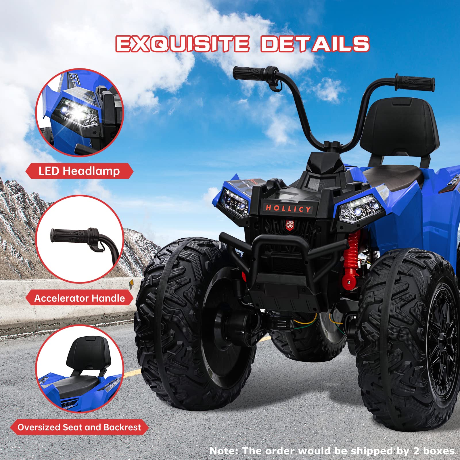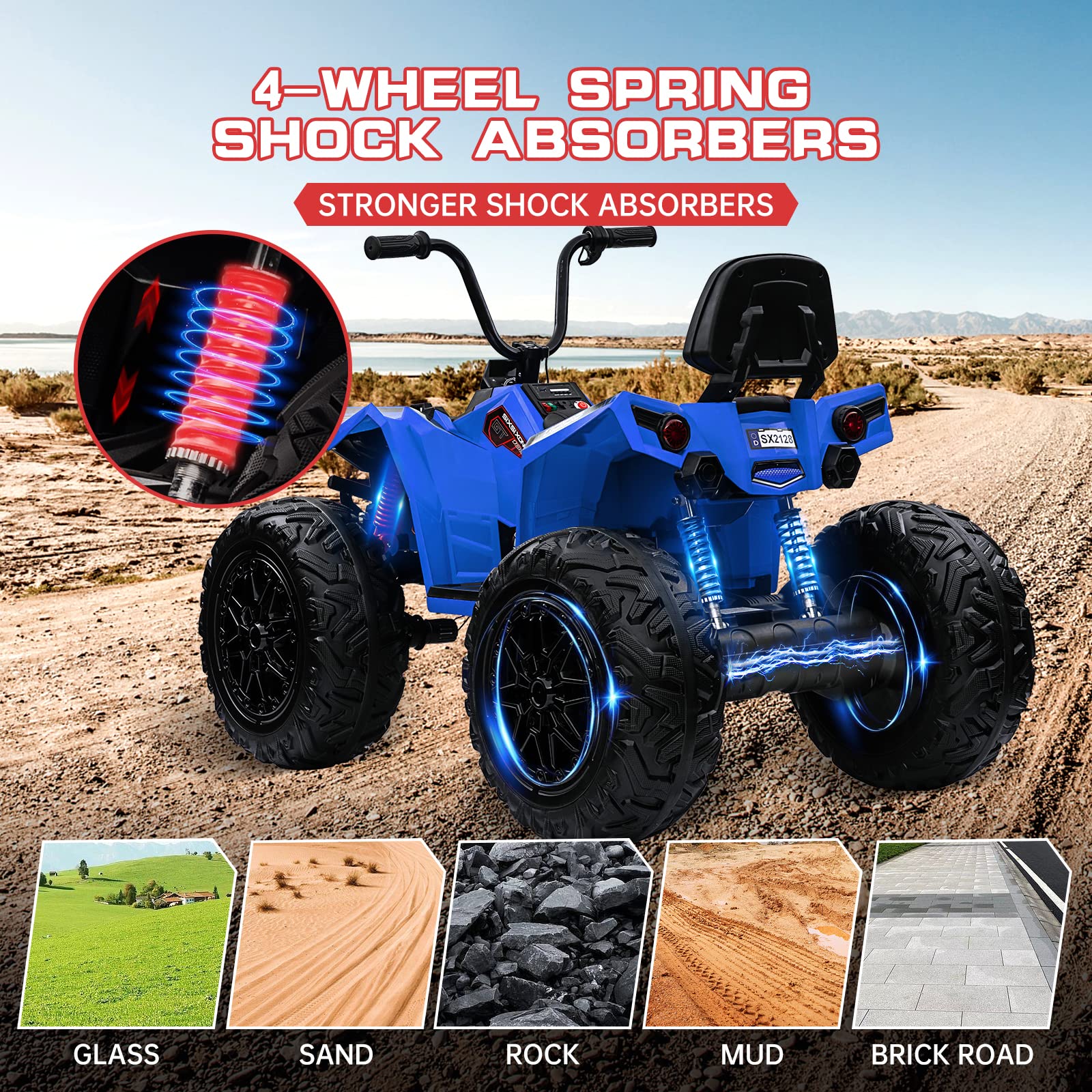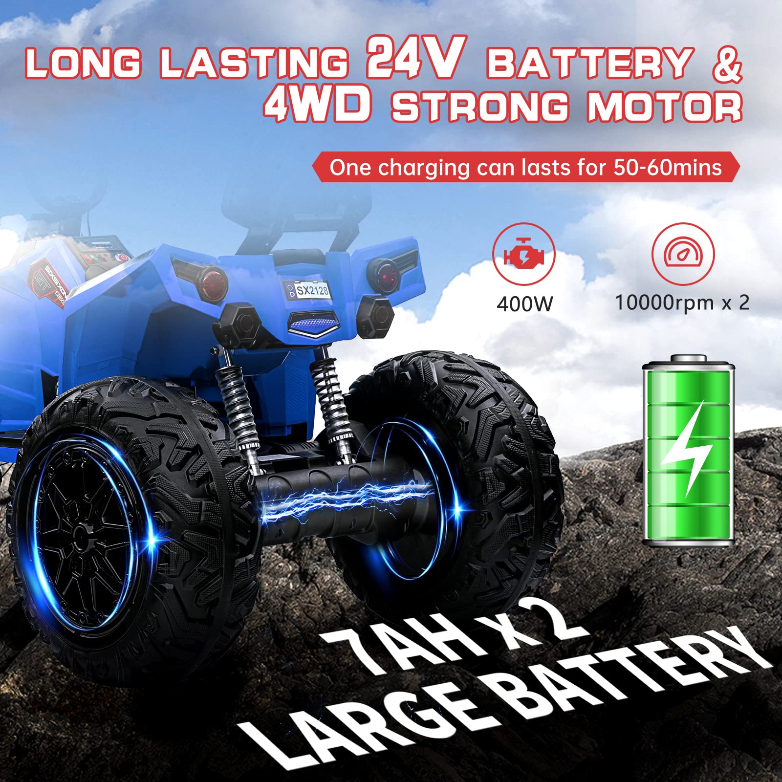 Garvee Ride - P Series: 24V Kids Quad ATV, Ride on Car 4WD Quad Electric Vehicle, 4x80W Powerful Engine, with 7AHx2 Large Battery, Accelerator Handle, EVA Tire, Full Metal Suspension, LED Light, Bluetooth&Music - Blue