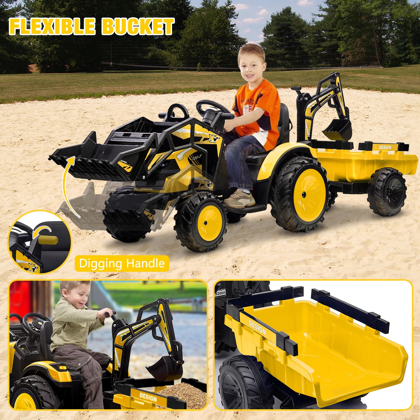 Garvee Ride P Series 3-in-1 Ride-On Tractor, 24V Electric, Excavator & Bulldozer, Remote Control, LED, Music, USB/Bluetooth max 66 lbs - Bright-Yellow