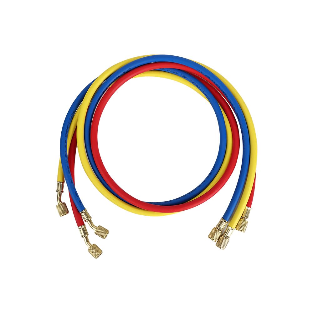 Set of 3 color-coded 1/4" SAE hoses, each 1.5M long. High-pressure rating of 800-4000PSI ensures safety and reliability in demanding HVAC applications.