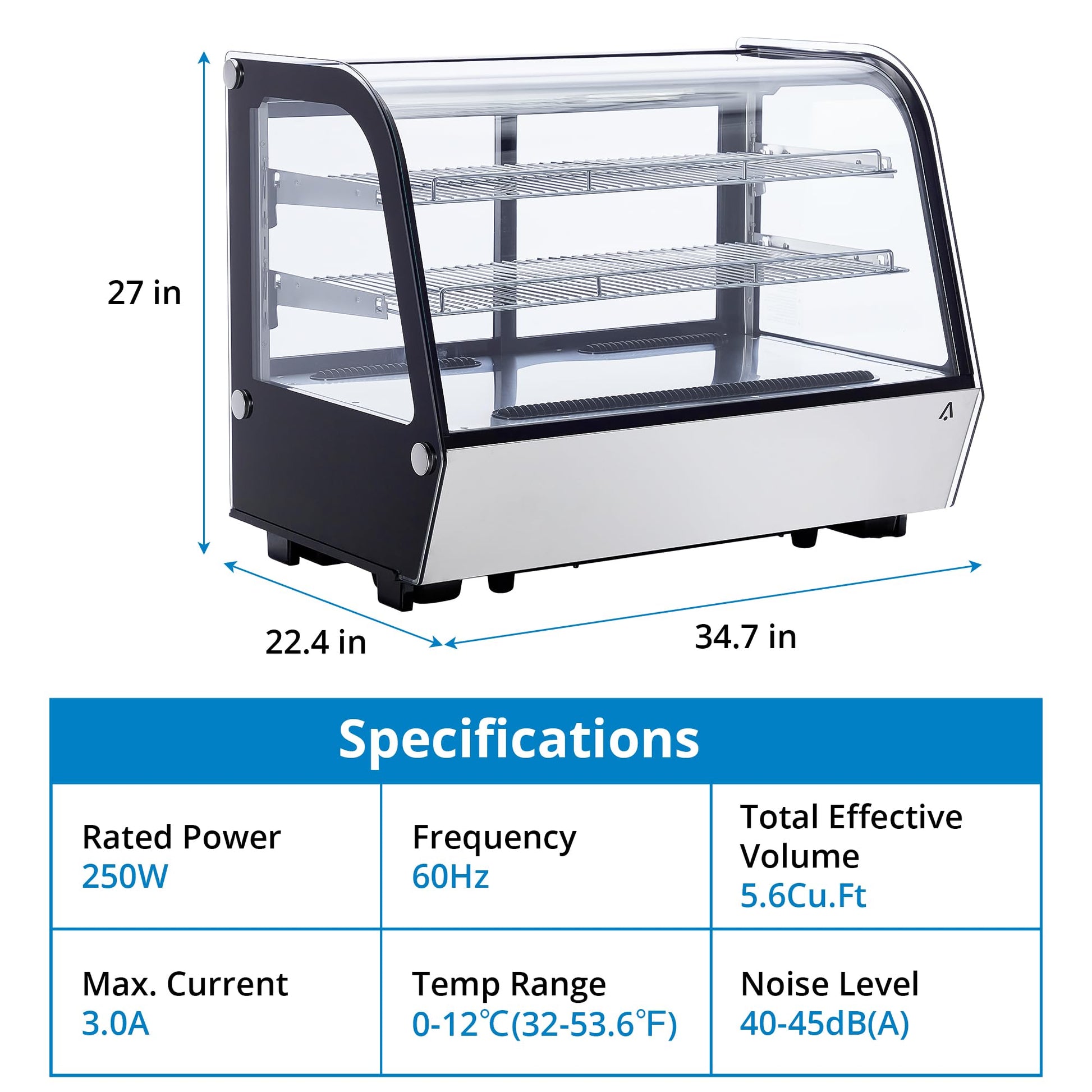 The two adjustable chrome-plated shelves offer versatility in displaying a range of products such as desserts, pastries, cakes, beverages, yogurts, and fruit cups, enabling you to customize the display to suit your specific merchandise needs.