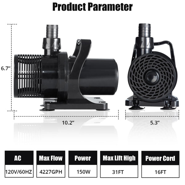 Garvee 4227 GPH Submersible Water Pump with 31 FT Lift and Adapters for Ponds, Fountains, Waterfalls, and Water Circulation, Aquarium Pump 150 Watts 16 FT Cord Quiet Operation Vertical/Horizontal