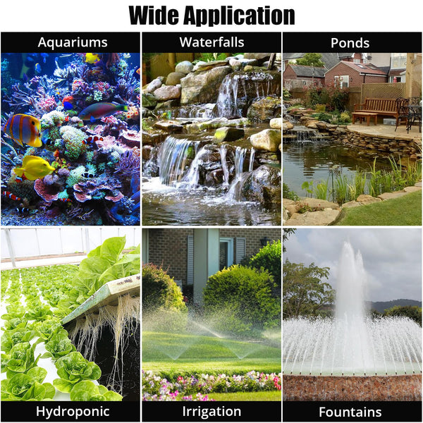 - Our submersible water pump functions in fountains, ponds, aquariums, hydroponics, and other small waters. Our functional and versatile design can be used for diving or land, giving users needed flexibility.
