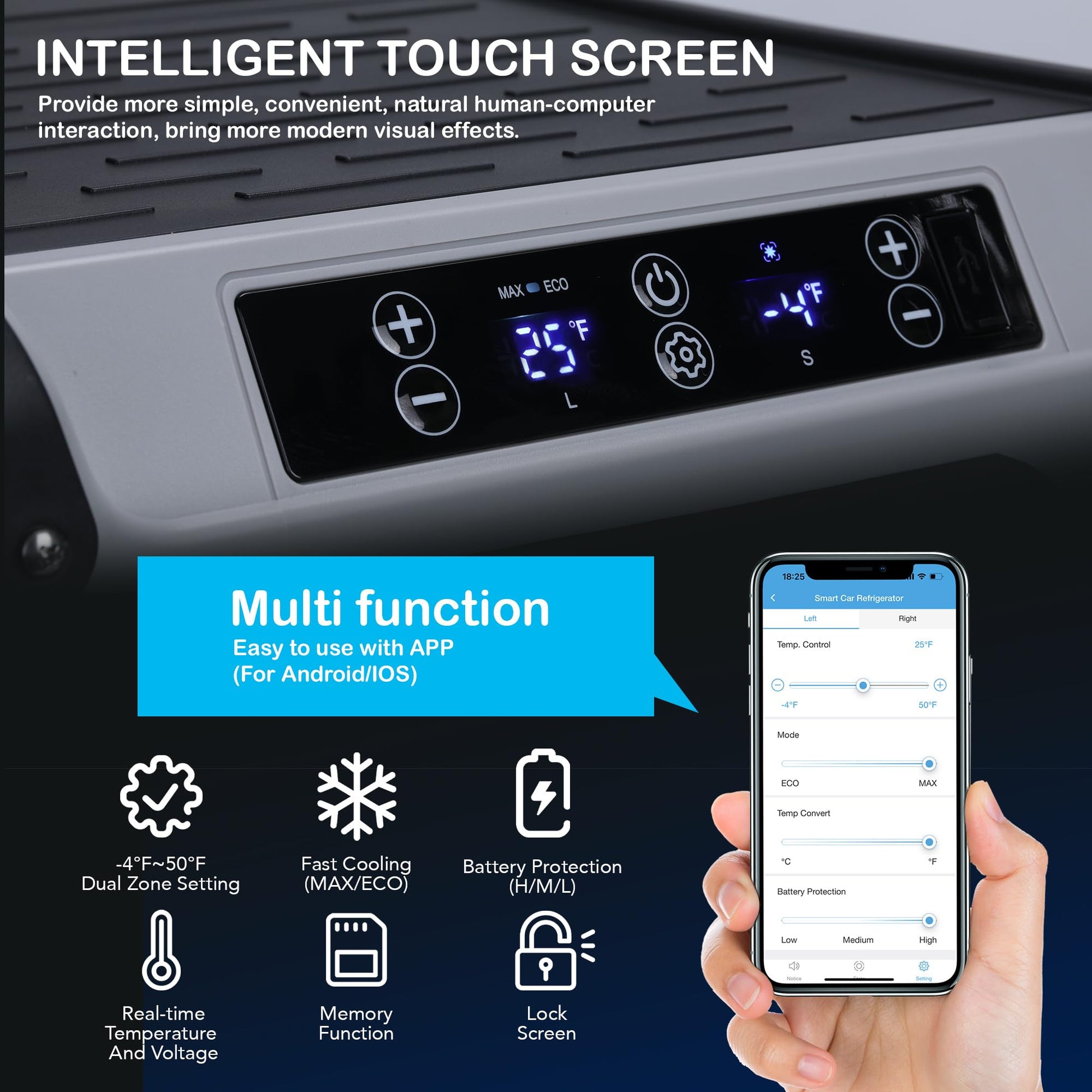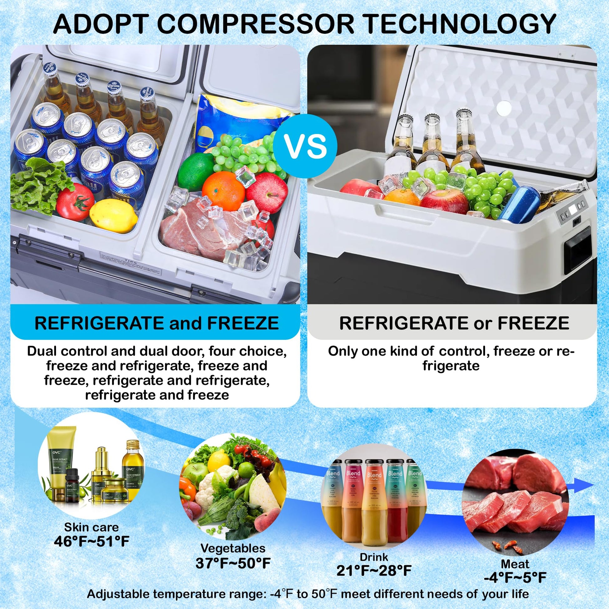 Discover the ultimate travel companion for your road trips, camping adventures, and home use - the innovative 53QT Dual Zone Electric Cooler. Meticulously designed to cater to your cooling and freezing needs, this portable car refrigerator offers unparalleled convenience and flexibility.