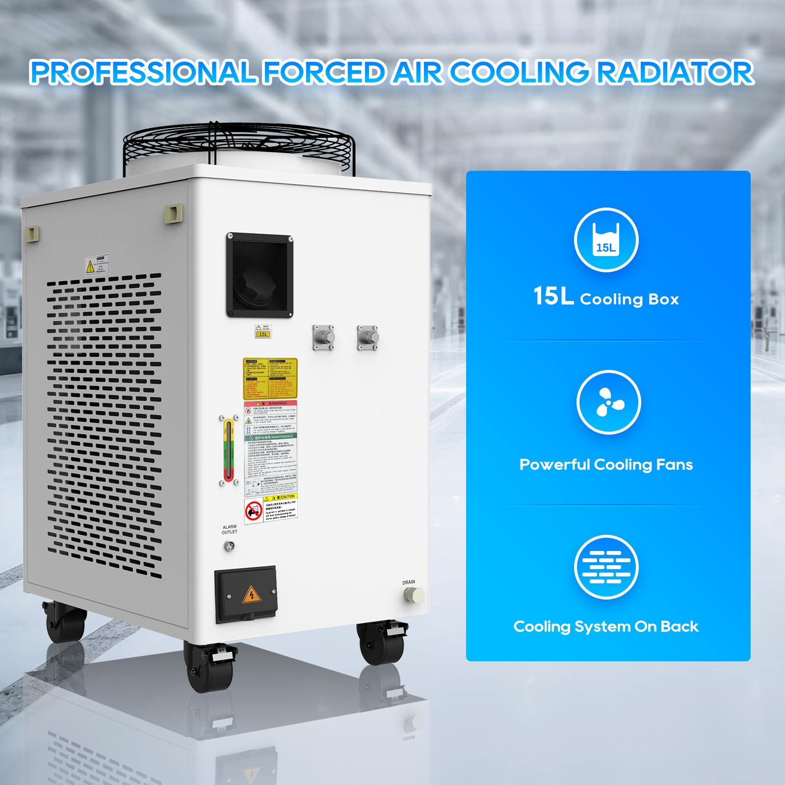 15L tank capacity with 8.7gpm flow rate ensures consistent cooling for demanding applications.