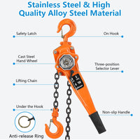 | Package Includes | 1 x Manual Chain Lever Hoist, 1 x Puller Pulley, 1 x Gear, 2 x Swivel Eye Hooks with Latches |