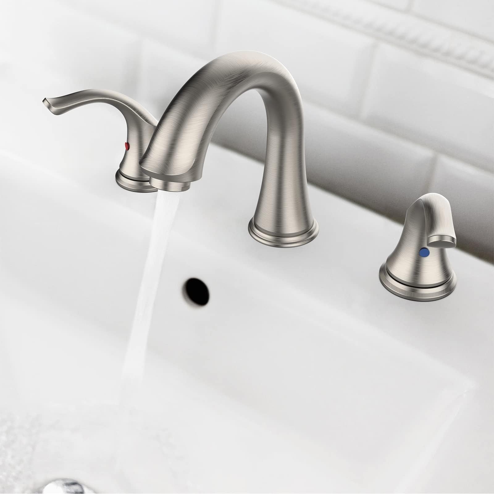 With its brushed nickel finish, pop-up drain, and double handles for precise temperature control, this faucet combines aesthetics with practicality. The 8-inch widespread design fits perfectly in modern bathrooms.